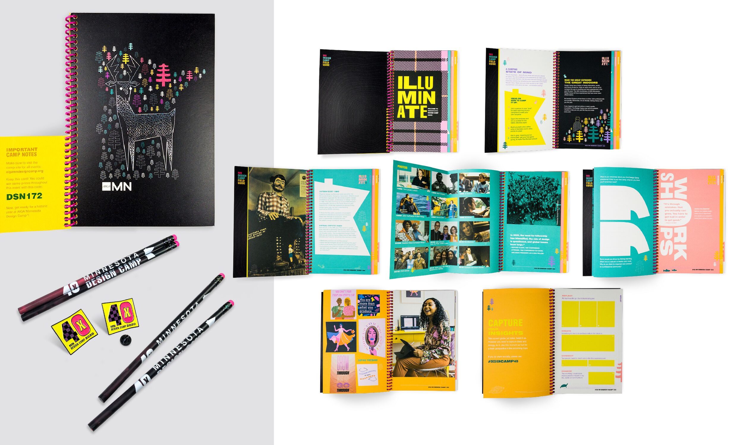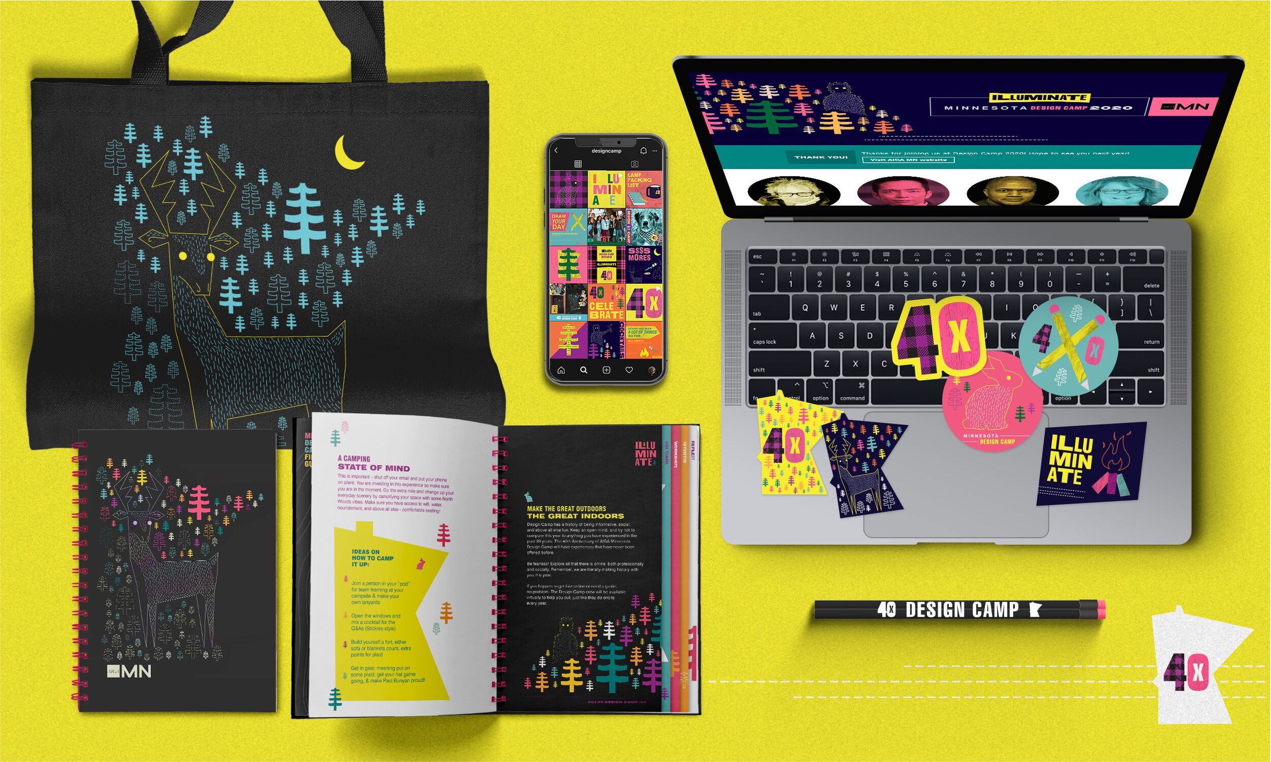 Each year hundreds of creatives travel to the North Woods of Minnesota for inspiration, education, and connection at AIGA Minnesota’s Design Camp. 2020 marked the 40th annual event that would have been an epic in-person celebration in addition to all of the other activities. The committee offered us the theme of illumination as a starting point. In the beginning, we translated Illuminate to mean that Design Camp is a beacon that calls to designers, and delivers knowledge and experiences in fun and engaging ways. We wanted to focus on the experience, the location, and the history. A combination of a highlighter style color scheme, icons, textures, and playful Minnesotan creatures started to visually depict the energy experienced at the traditional design conference. And then everything changed because of Covid. Less than two months before the event, the difficult decision was made to go 100% virtual. Illuminate took on the meaning of shining on, rekindling your passion, being the beacon, and still being playful with embellishments.