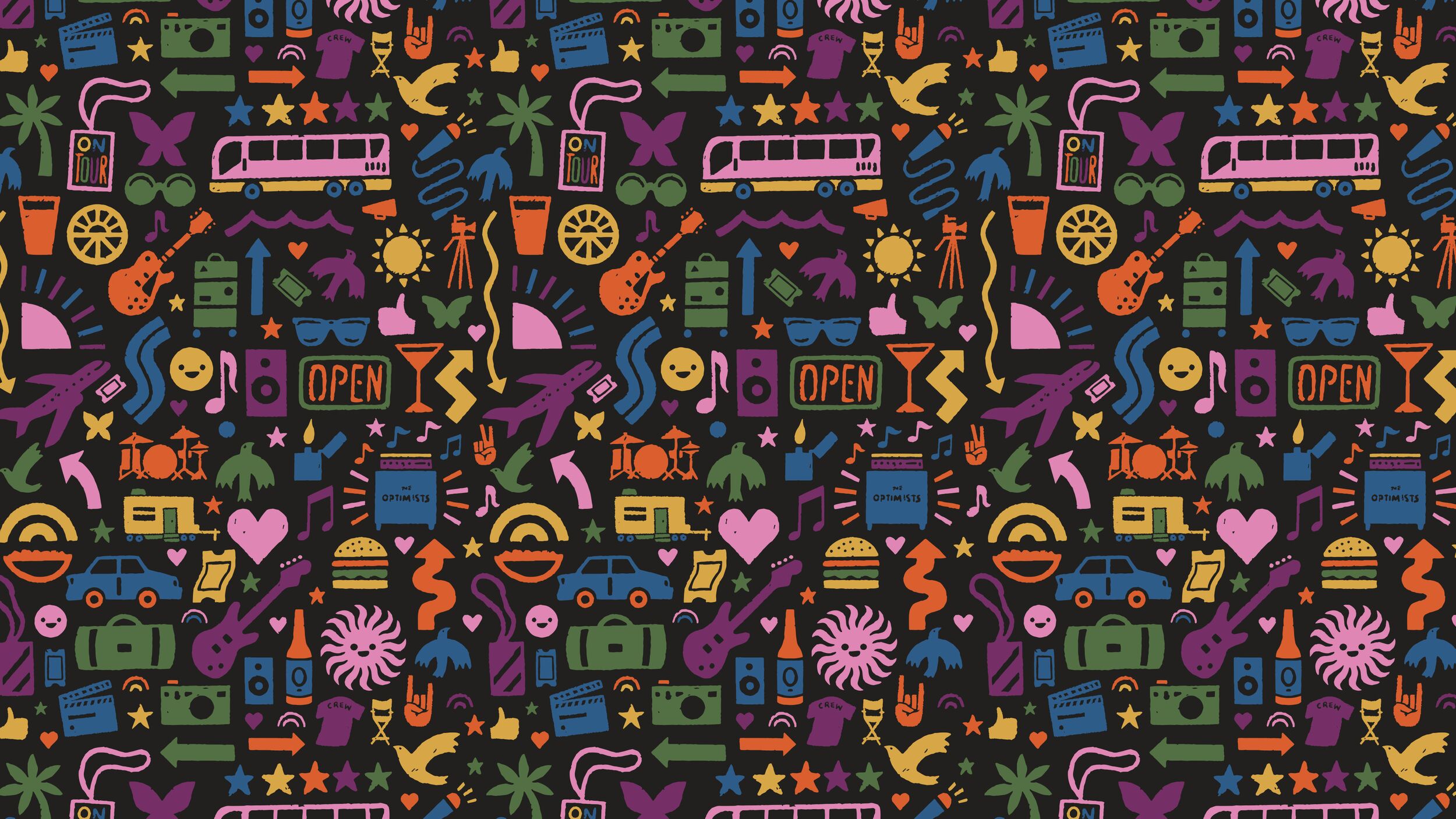Illustrative graphic elements (vehicles, gear, places and feelings) are inspired by things experienced while on tour.